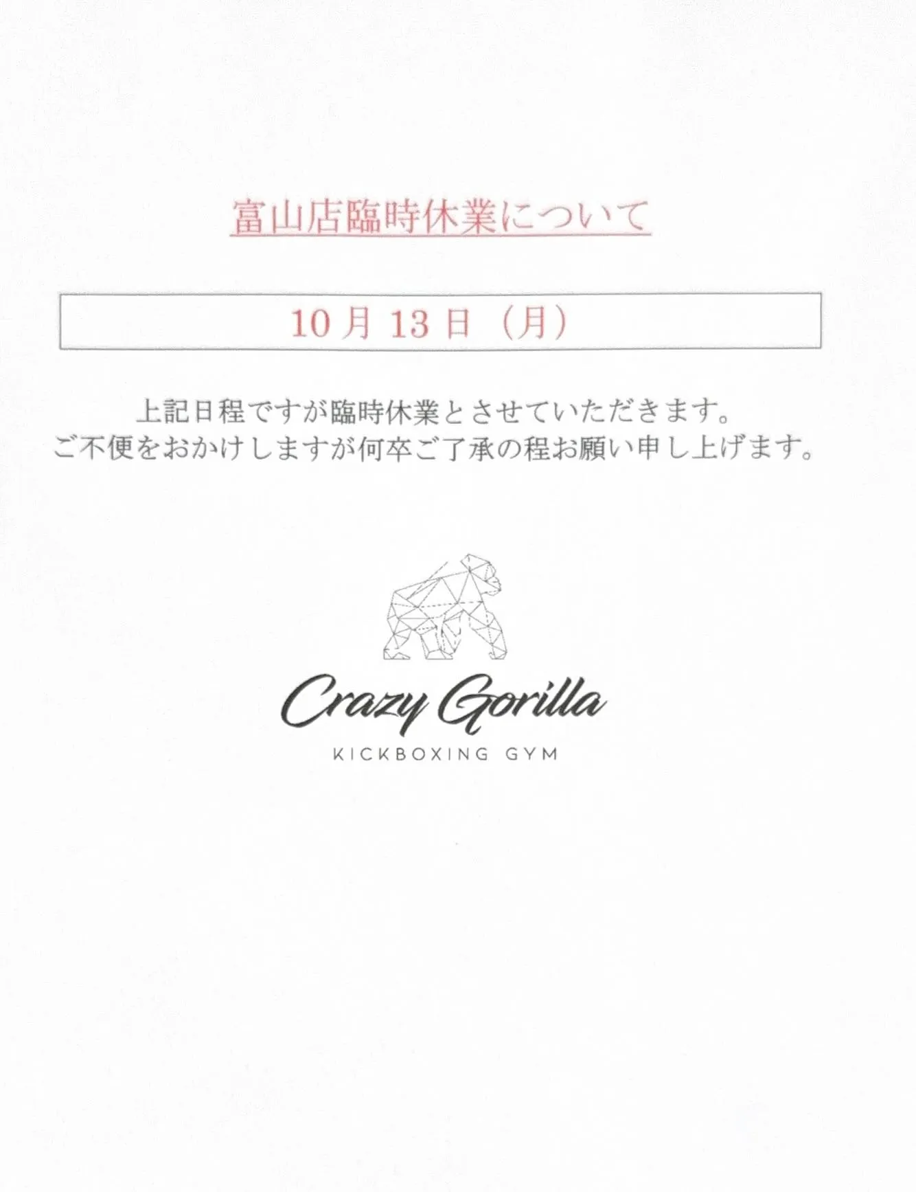 富山店臨時休館のお知らせです。 2025/09/30 富山店臨時休館のお知らせです。 大変急ですが表題の通り 10月13日(月祝)を臨時休館とさせていただきます。 皆様にはご不便をお掛けしますが何卒ご理解の程よろしくお願いします。